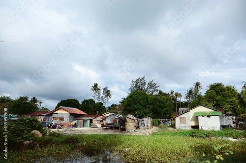 THAILAND, BANGKOK: Scenic landscape view of isolated Thai island with palms and traditional houses