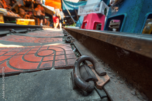 Thailand, Samut Songkhrami, Mae Klong railway market also called Siang Tai. Tourists walk along the train tracks and make purchases from local sellers. A p place among tourists from all over the world