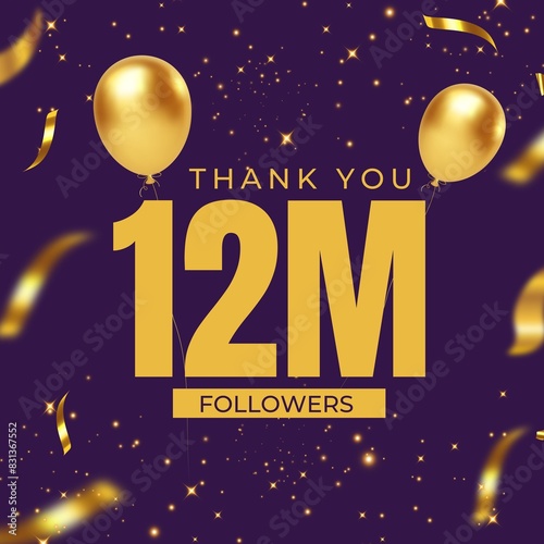 Thank You friends and fans for 12 Million Followers banner design with golden confetti and gold balloons and purple background