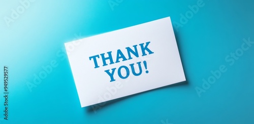 "THANK YOU!" Written in Blue Letters on a White Paper Card Against a Light Blue Background