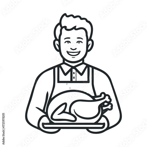 Thanksgiving celebration with chef presenting roasted turkey. Vector black icon