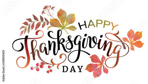 Thanksgiving Day festive lettering design with autumn plant elements. Celebration handwritten phrase Happy Thanksgiving for postcard, icon, logo or poster.