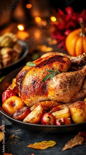 Thanksgiving turkey, vibrant colors, delicious dishes, close-up, inviting