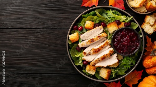 Thanksgiving-themed salad with mixed greens, shredded turkey, cranberry vinaigrette, cornbread croutons, on a wooden dining surface, autumn leaves decor