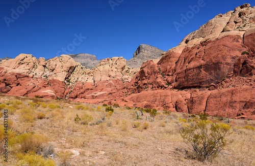 the colorful, eroded rocks of red rock national conservation area on a sunny day in the mojave desert, near las vegas, nevada