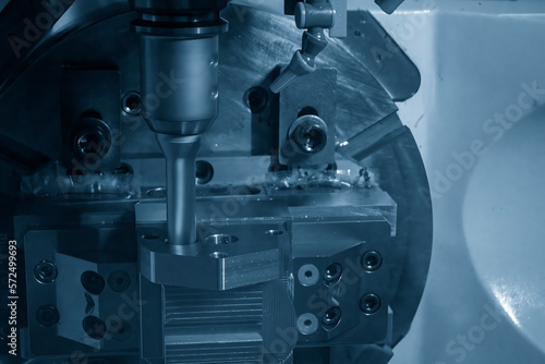 The 5-axis CNC milling machine hole cutting on the metal part.