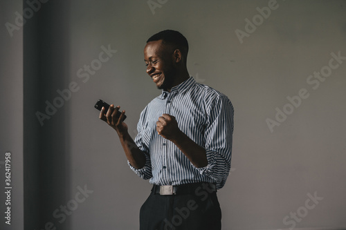 the African-American answered the phone and got some very good news. happy african guy euphoric looking at cell phone celebrate good news victory success