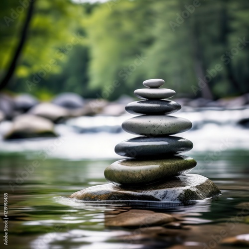 the AI Image Generator, Stacked Stones on a River Reflecting Tranquil Nature