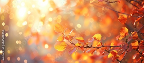 The amber sun shines through the orange leaves of a deciduous tree, casting tints and shades on the grass below in the natural landscape