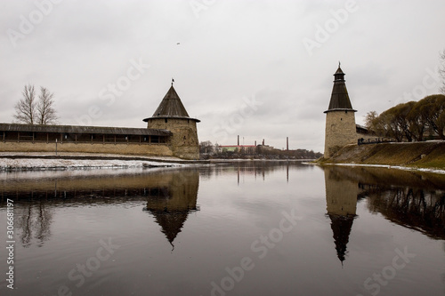 The ancient medieval fortress is located on the river Bank. The fortress is covered with fallen snow. Pskov, Russia.