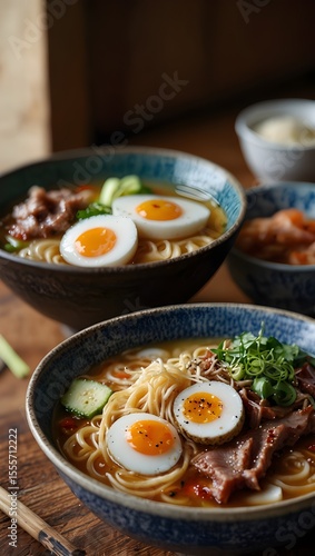 ramen, noodle, japanese food, asian cuisine, bowl, soup, broth, pork meat, egg, scallion, green onion, delicious, savoury, hot, comfort food, lunch, dinner, meal, eatery, table, wood table, authentic, traditional, epicure, culinary, food photography, studio shot, closeup, appetising, cooked, prepared, fresh, homemade, hearty, flavorful, warm, healthy, epicure, nobody