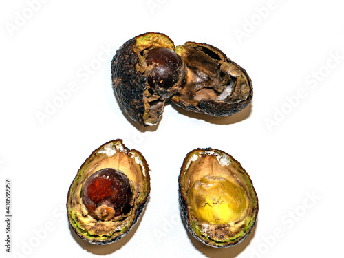 the avocado is spoiled with rot and mold. Rotten avocado split in half with mold where the inner and outer part is seen on a white background.