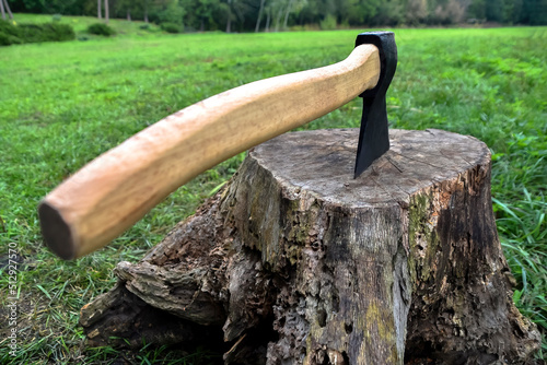 The ax is stuck in a dry stump, against the backdrop of nature. Human and nature
