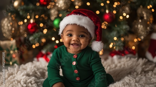 baby, christmas, holiday, joy, festive, smiling, cute, decoration, winter, children, celebration, santa, costume, cheerful, light, happiness, tree, sitting, portrait, fun, green, red, seasonal, adorable, family, gift, indoor, cosy, love, magic, traditional