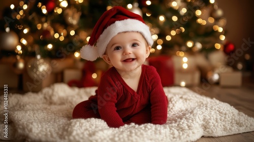 baby, christmas, holiday, happiness, smile, celebration, tree, decoration, red, santa, festive, portrait, cosy, indoor, light, joy, cute, family, tradition, warmth, gift, children, winter, fun, adorable, infant, togetherness, cuddly, cheerful, playful, gown