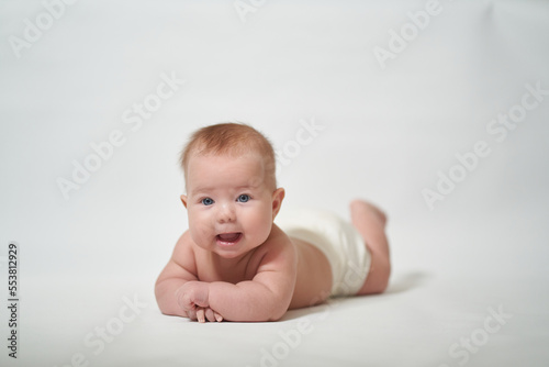 The baby is lying on his belly smiling and looking at the camera with his mouth open against a white background.