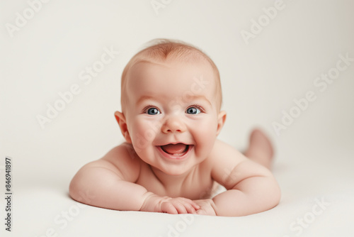 The baby smiles, lies on his stomach on a light bed
