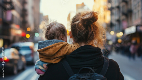 mother, holding, children, back, urban, city, outdoors, street, beauty, looking, outside, face, teenage, happiness, fashion, jacket, 1, fun, woman, people, smiling, person, boy, smile, model, hair
