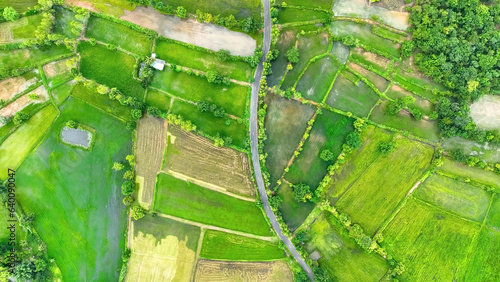 The background texture by Drone view with rice plantation the landscape view of rice terraces in the morning at Chiangmai, Thailand