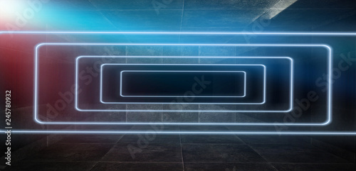 The background is an empty tunnel, the room is lit by neon light. Concrete covering, tile. Smoke. Laser square figure in the center of the room. 3D rendering