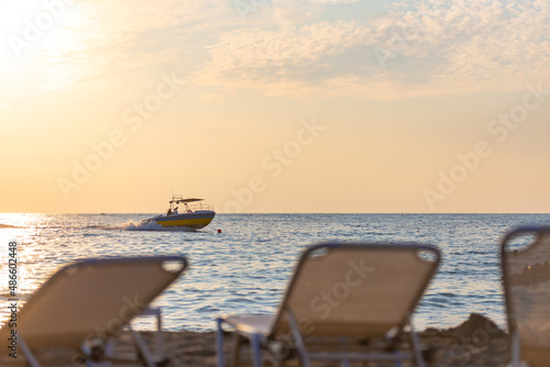 The backs of the sun loungers in front of the sea with a boat. Evening on the beach. Focus on the boat.