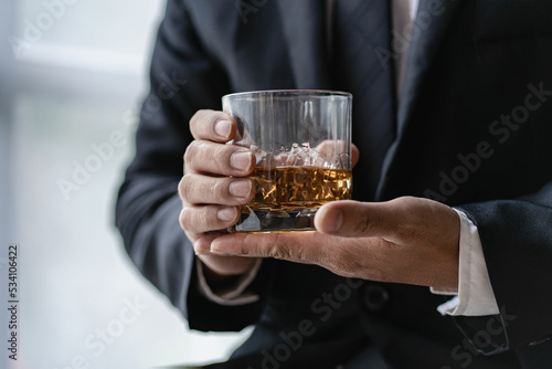 The bartender holds a glass of whiskey and ice to the male guest. The rest of the concept in the bar Close-up of serious businessman holding whiskey showing executive privilege concept.