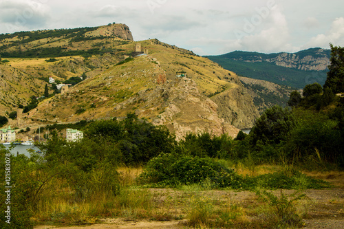 The beach in the Crimea. The rock in the black sea. Beautiful Crimean landscape, on the black sea.