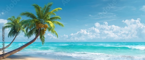 beach, ocean, palm, tree, tropical, sky, cloud, summer, vacation, nature, paradise, sand, wave, scenic, blue, horizon, shoreline, relaxation, tranquil, landscape, travel, resort, coast, sunlight, seascape, beautiful, breeze, wind, bright, idylli, isle, escape, nautical, serene, calm, moisture, warmth, aquatic, sunny, banner