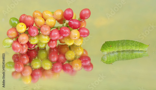 The beautiful reflection of a green caterpillar in the glass. This insect likes to eat fruit, flowers and young leaves.