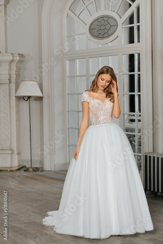 The beautiful woman posing in a wedding dress. Young beautiful happy bride wearing white wedding dress and posing in bright empty interior. Wedding fashion. Expensive Lace bust.