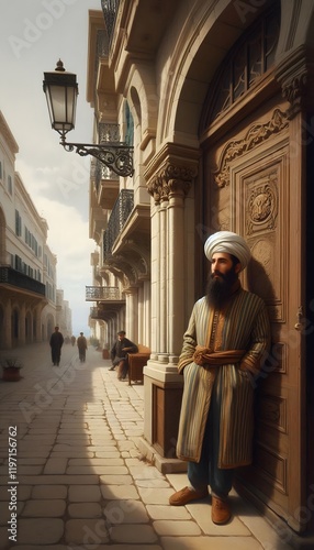 The Belle Epoque, Tunis in 1835, a handsome man wearing traditional clothes, he stands in front of his house on the boulevard