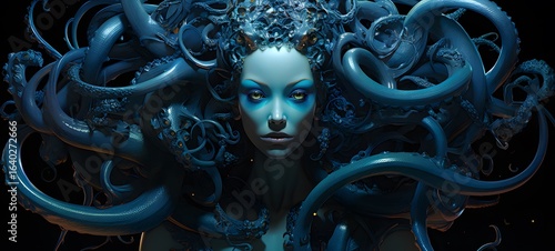 The black background contrasts sharply with the bright blue diamonds light emitted by Medusa kraken MONSTER,generative AI