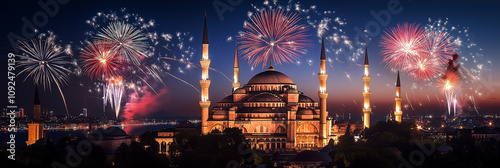 istanbul, fireworks, night sky, turkey, illuminated, minaret, celebration, festival, city landscape, middle east, travel destination, majestic, historic site, spiritual, night photography, romantic, timeless, grandeur, tour tourism