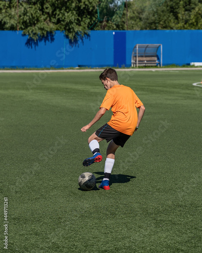 football, boy, play, in, training, boot, ball, football, t-shirt, lawn, field, gate, leggings, guy, goal, score, guy, team, stroke, kick, game, ball game, period, penalty, free kick, orange, black, underpants, short, exercise