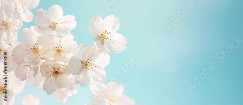 The branch of a tree has white flowers blooming in the springtime on a blue sky background.