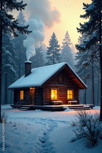 The cabin's chimney puffing out smoke into the air, warm, cozy