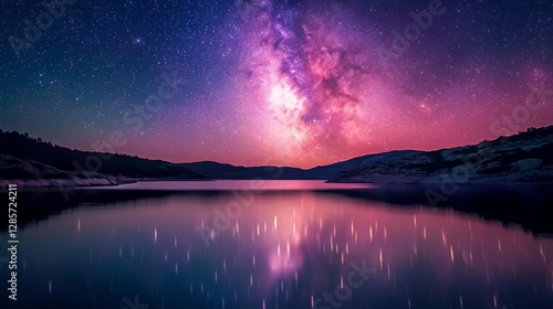 The calm water of Codole lake in Corsica reflects the beautiful sky filled with pink and purple stars.