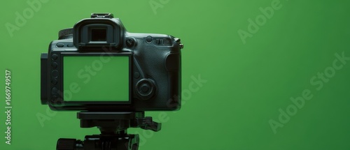 camera, tripod, photo, studio, green, background, lcd, display, viewfinder, equipment, professional, digital, lens, rig, videography, production, chroma, content, media, contraption, technology, isolated, minimalist, composition, sharpened, shot, capture, gear, black, copy space, closeup, angle, modern, wide