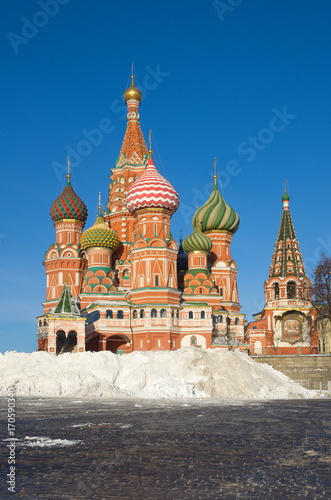 The Cathedral of the Intercession of the blessed virgin on the Moat (Temple of Basil the blessed) in red square, Moscow, Russia. Big snow snow after a snowfall