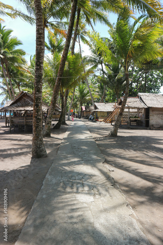The cement-cast path on a beach is surrounded by shady coconut trees with a tropical atmosphere that is very pleasant as a holiday destination