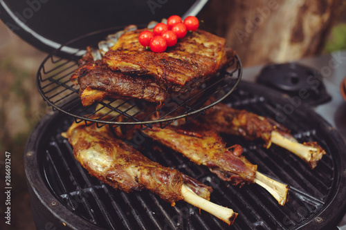 The chef is cooking meat on the grill. Golden rib steaks and chicken with grilled vegetables, delicious food