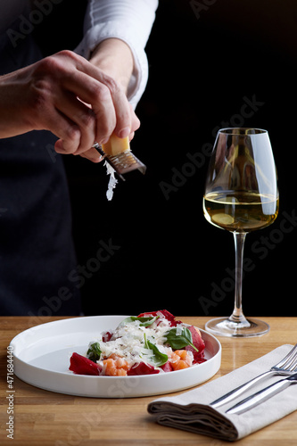 The chef prepares a salad with salmon. Rubs cheese on a grater. salmon salad with beet cheese and green leaves on wooden table with glass of white wine.