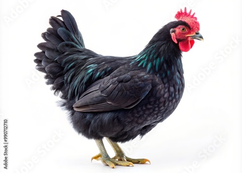 The chicken's imposing form confronts the camera, its dark feathers a striking juxtaposition to the pure white