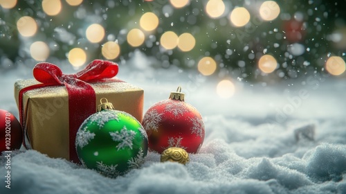 christmas, snow, decoration, gift, ornament, holiday, festive, winter, celebration, pine, shiny, red, green, gold, background, bokeh, traditional, cheerful, season, present, sparkle, cosy, joy, greeting, wrapped, glistering, fun, new year, warmth, family