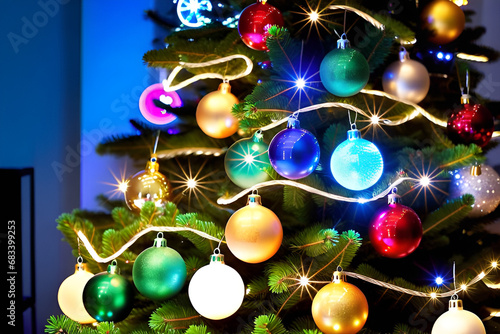 The Christmas tree sparkles with colorful lights, casting a warm and festive glow. Generative AI.