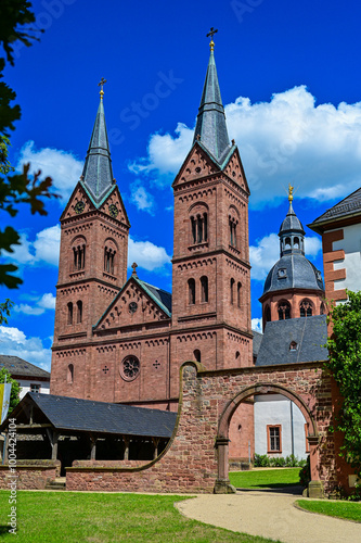 The church Basilica Seligenstadt St. Marcellinus and St. Peter of the monastery Seligenstadt as a parish church with blue sky and sunshine in summer, Seligenstadt, Hessen, Germany