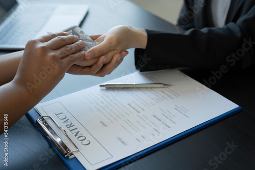 The client hands the money to the Asian female agent, a fictitious agent in an agreement to sell the house in the office.