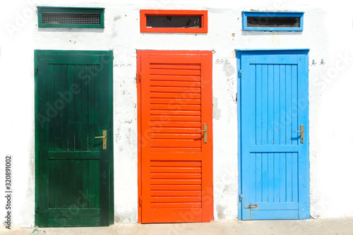 The colorful doors of one of the old changing rooms or cabins at a beach in Croatia.
