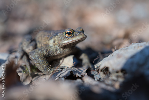 The common toad, European toad (Bufo bufo) in forest at springtime, toads are useful in the garden, they eat slugs and snails.
