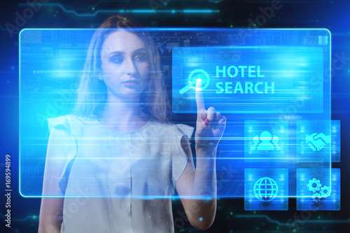 The concept of business, technology, the Internet and the network. A young entrepreneur working on a virtual screen of the future and sees the inscription: Hotel search